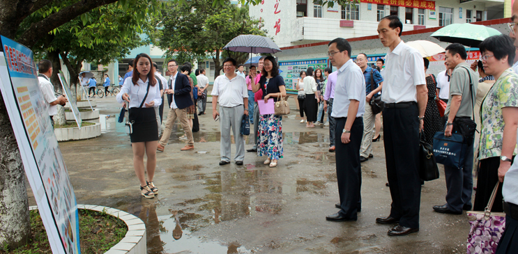 开幕式结束后,王斌伟、傅湘龙、和飞、周苏平等省厅领导、学校领导,以及其他部分与会人员来到怀集、封开两地,深入我校教师教育改革创新试验区的两所基地学校进行现场考察。在怀集的岗坪中学,考察团听取了我校实习生对顶岗实习工作的汇报。在封开的长安中学,考察团听取了教师教育学院院长肖起清对以试验区为基础建设起来的山区卓越教师UGS协同育人平台的介绍,并听取了肇庆市教育局、封开县教育局、广宁县教育局以及长安中学负责人的报告。