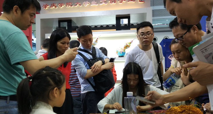 为了帮助观众了解展品的设计制作过程,美术学院的专业团队进行了现场示范,并同步地与观众开展交流、互动,气氛十分热烈。师生们独具匠心的设计和精致的手工,在吸引众多观众驻足观看的同时,也吸引了多个商家代表前来洽谈相关事宜。