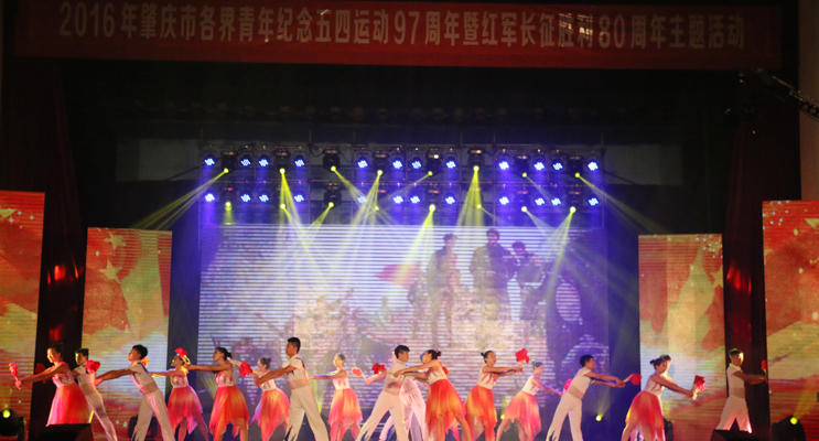 本网讯(记者 何婕妤 江植聪)5月4日晚,主题为“青春向党•梦想绽放”的肇庆市纪念“五四”运动97周年暨红军长征胜利80周年文艺晚会在我校体育馆举行。晚会以丰富多彩的内容和推陈出新的形式,表达肇庆广大青年胸怀祖国,积极向上,发奋成才,服务社会的决心和斗志。