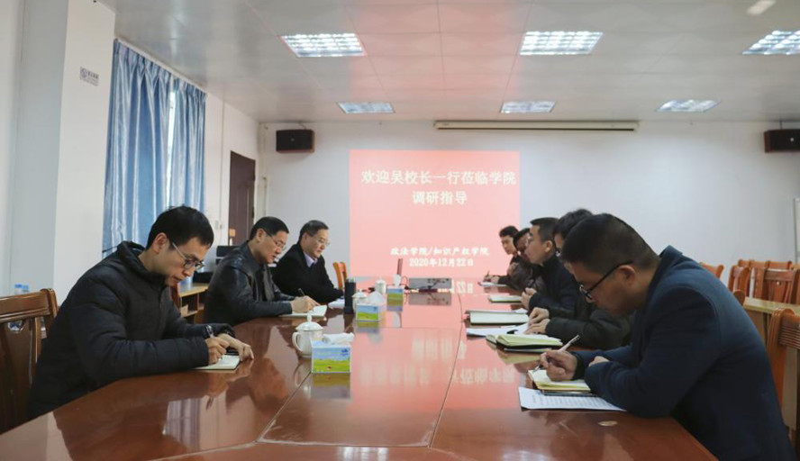 本网讯 12月22日,校长吴业春在校长助理胡正发的陪同下,来到政法学院、知识产权学院开展调研,院长祁建平、院党委书记侯玉基参加活动。