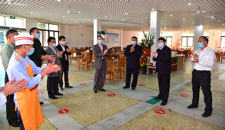 教工餐厅跟平时既不一样也一样,所谓不一样,自然是没有开学期间的那种热闹情景;而一样之处是同样的窗明几净,同样的为留守的教职工提供餐饮服务。相比之下,一样之处比不一样之处。给人更突出的印象、给人更温馨的感觉。曾桓松一行来到这里与餐厅工作人员进行亲切交流,交流的内容既有深情的慰问也有热情的祝愿。“对餐厅在年三十和年初一免费为师生提供膳食的暖心做法”,他给予了充分的肯定。