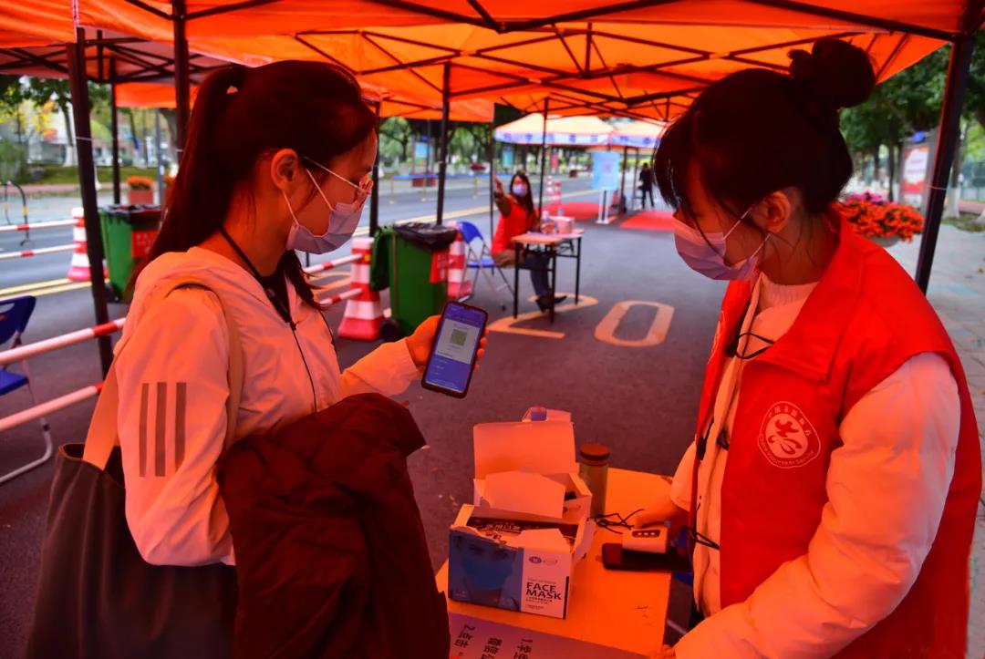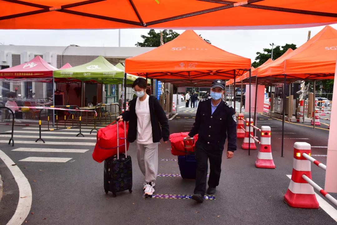 早上6点多,学工队伍、保卫处工作人员、机关党员志愿者已经在校门忙碌起来,设置入校隔离栏,摆放好物品……8点多,开始陆续有学生入校。在校门口,每位学生经过扫码报到、出示健康码、换上工作人员递过来的新口罩、进行行李消毒,便可以回到自己的宿舍区。