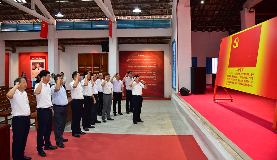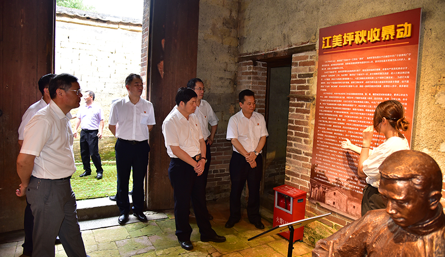随后,曾桓松一行来到广东省第一批红色村江美村接受红色历史教育,逐一参观江美乡农民协会旧址(初心堂)、江美农民协会史迹陈列馆和中共广宁县委旧址,观看革命老区党史展览区、文物展示区、广宁革命遗址分布沙盘,并收看介绍广宁革命历史的短视频,深入了解大革命时期广宁共产党组织领导当地农民开展减租斗争、武装斗争和建立红色苏维埃政权的历史。在江美乡农民协会旧址(初心堂),曾桓松带领大家重温入党誓词。