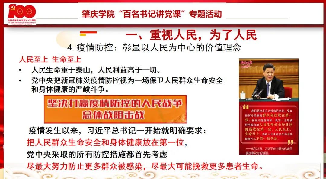 党课中,黄劲松把政治理论与生动史实相结合,列举红船精神、井冈山精神、长征精神、焦裕禄精神、铁人精神、雷锋精神、抗疫精神、脱贫攻坚精神中的典型事例,表明这些精神其中所蕴含的共产主义价值内核就是我们党从初创到现在始终坚守的精神根脉。他强调同学们要从党的百年奋斗历程中汲取继续前进的智慧和力量,继承和学习那些富有生命力的仍然行之有效的伟大精神、宝贵经验。他希望同学们能够学史知史、知史爱党、知史爱国,为实现中华民族伟大复兴的中国梦贡献青春力量、谱写青春华章、绽放青春光彩,以优异成绩向建党100周年献礼!