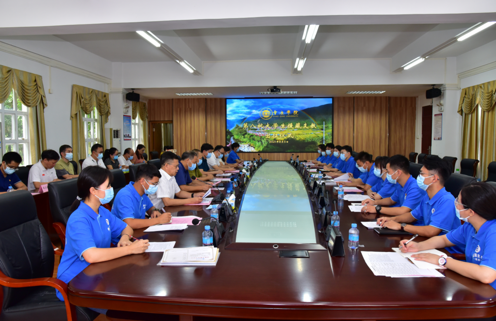 当天下午,我校第八批大学生援藏支教出征仪式在文笔峰临峰厅举行。校党委副书记、纪委书记黄劲松,校党委委员、党委组织部部长欧洪湛,校党委委员、党办校办主任谭冠中,校党委委员、党委宣传部统战部部长陈前,以及党委学生工作部(处)、团委等职能部门负责人,第八批援藏支教服务队成员所在学院领导和第八批援藏支教服务队全体师生出席仪式。仪式由党委学生工作部(处)长陈向荣主持。