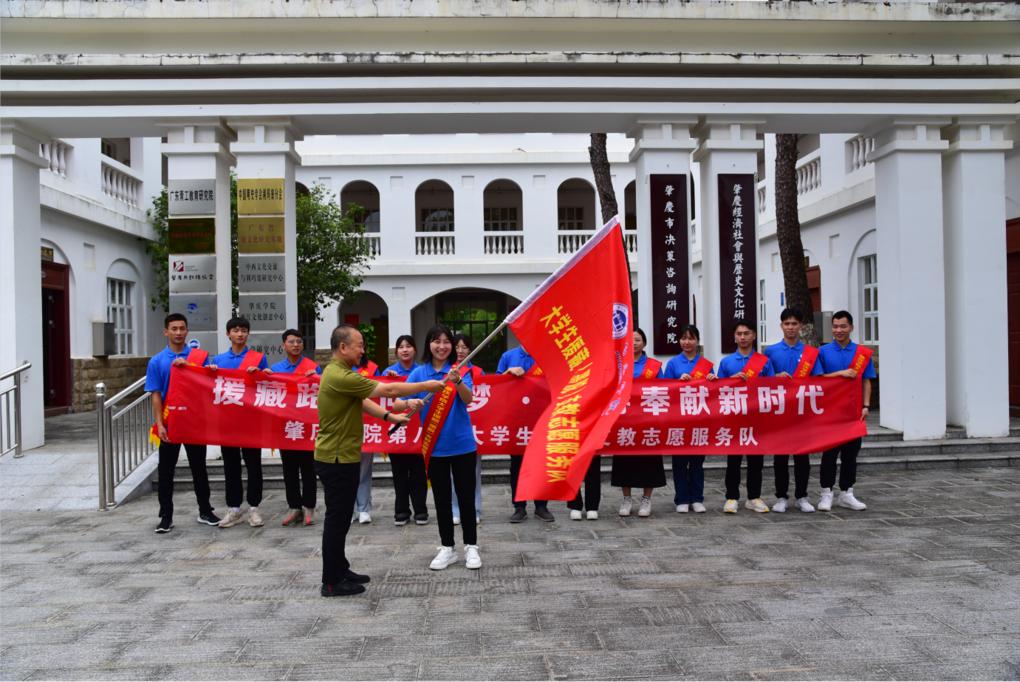 为勉励支教队员实现梦想,满载而归,与会领导为全体支教队员佩戴绶带,颁发证书,并向支教服务队颁授队旗。这面鲜艳的队旗承载了我校前七批援藏支教队员结下的累累硕果,并将激励第八批队员继续发扬服务社会的志愿者精神,不负青春,不负韶华。