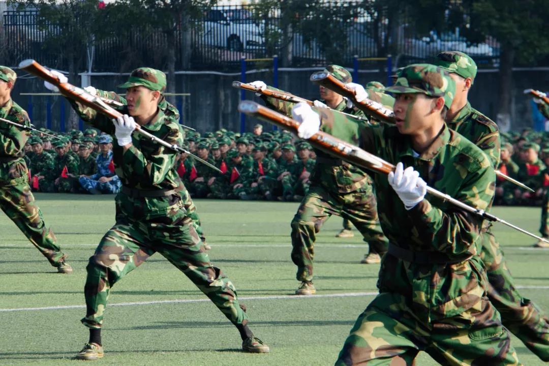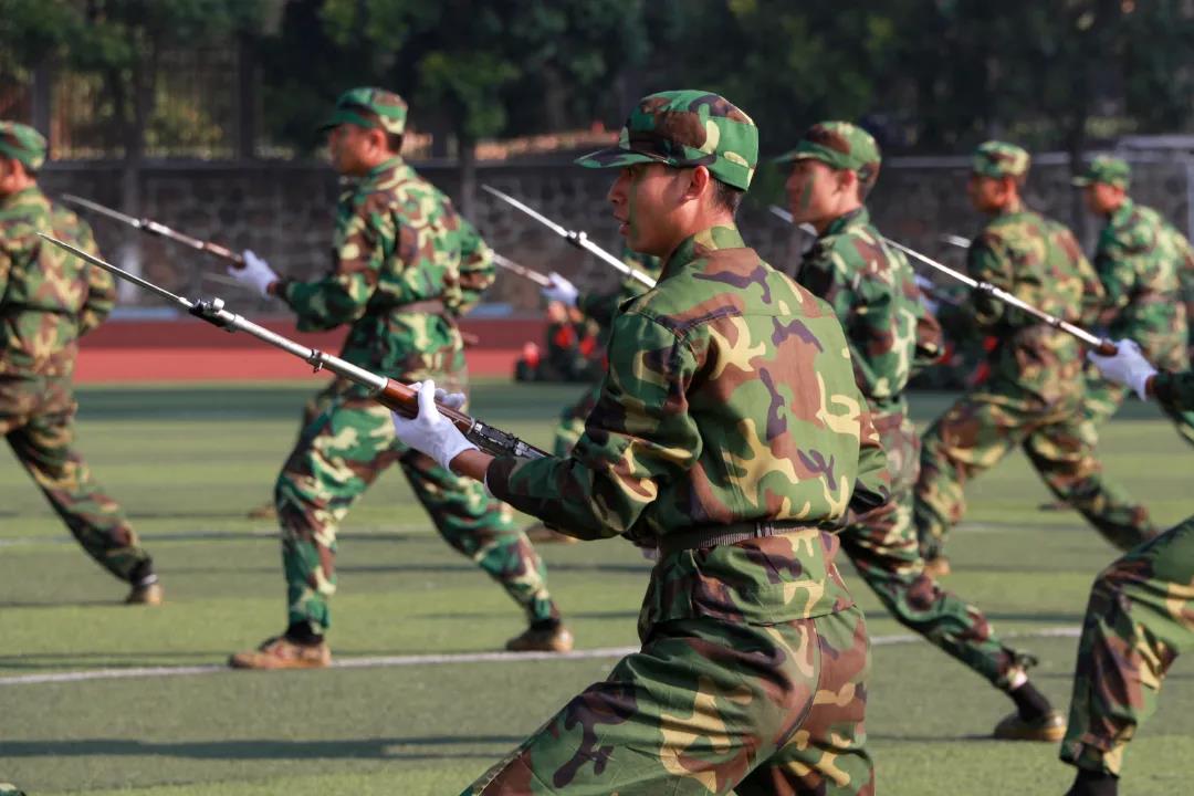 刺、防、劈、蹬,美术学院学员神采飞扬,新生们紧握钢枪,威风凛凛,刺杀动作干净利落,战斗作风勇敢顽强。