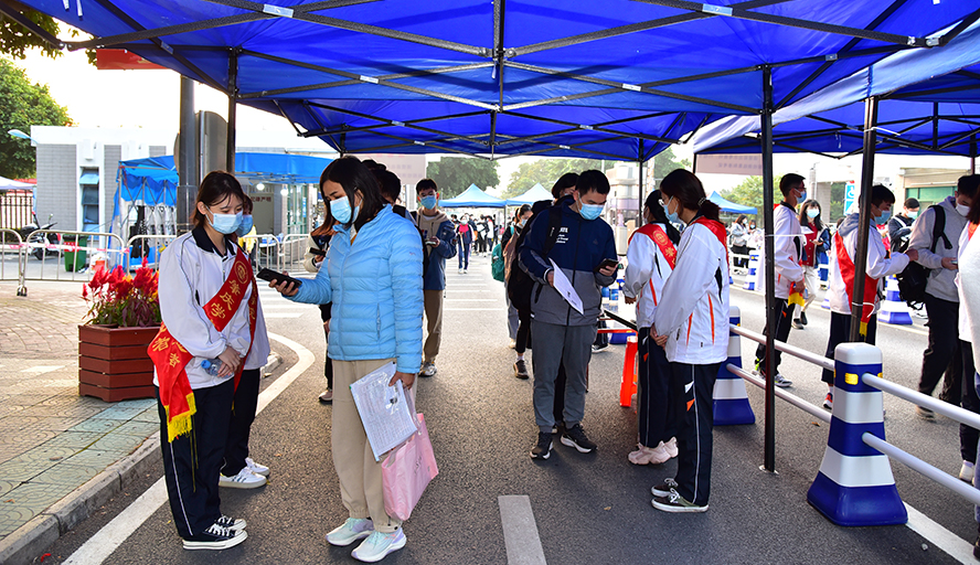 为做好疫情防控常态化下的组考工作,确保广大考生和考务人员健康安全,我校高度重视疫情防控工作,在校门口和考场外均设有检录通道,并配备应急药物、消毒药水等相关防疫物资,安排医务人员和志愿者进行防疫检查,实时掌握了解考生身体情况。通过检录通道时,考生需持身份证、准考证、48小时核酸检测阴性报告,查验粤康码,进行体温检测后,方可进入考场参加考试。考试时,考务人员与考生需全程佩戴口罩。