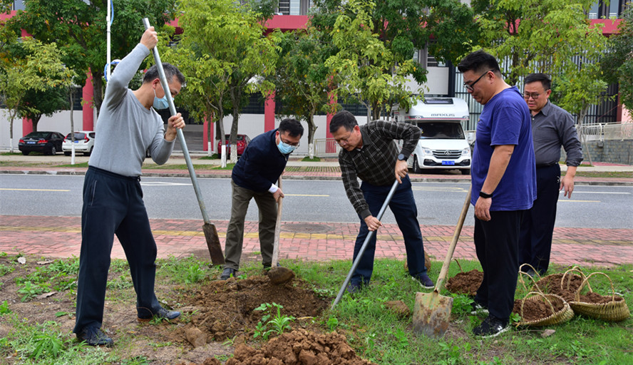 义务植树活动在学府南路、西苑西边空地开展。师生们在做好疫情防控的前提下,挥锄挖穴、培土围堰、提水浇灌,一派热火朝天的景象。当天就种下了红花玉兰、本地樟树和黄花风铃木等苗木300多株,为美丽砚园增添了更多的景观点。