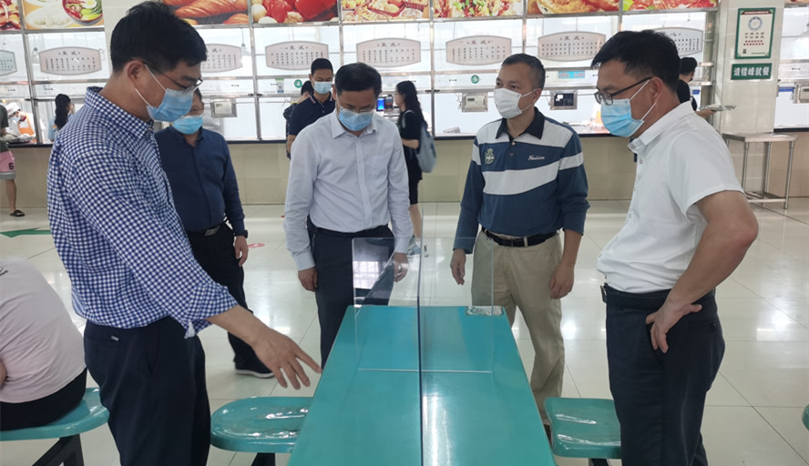 谢冠华在检查中要求各食堂要严格按照学校疫情防控工作指引,强化人员就餐指引,避免人员扎堆聚集,加强防控过程监管,做到人、物、环境同防,要求在就餐人数较多的食堂餐桌上安装隔离板,扎实推进食堂疫情防控和食品安全工作落实。