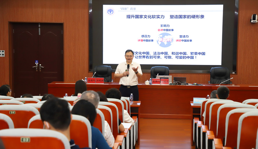 本网讯 5月25日,广东外语外贸大学副校长、教育部“新世纪优秀人才培养计划”入选者、广东省高等学校“千百十工程”省级学科带头人培养对象、博士生导师刘建达教授应邀来到我校,为外国语学院全体教师讲授题为《“四新”背景下外语教学评创新发展》的专题讲座。副校长胡文涛出席,外国语学院院长江晓红主持。