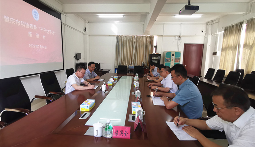 本网讯 7月14日,肇庆市科学技术协会主席余飞兴、学会部部长莫秀坤到访我校,展开“千干访千才”座谈会。副校长胡文涛出席座谈,我校教授代表参会。