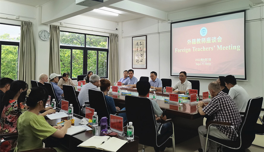 副校长胡文涛主持,国际合作与交流处处长钟伙彬,外国语学院、环境与化学工程学院、音乐学院、美术学院等二级学院负责人,全体外籍教师参加。