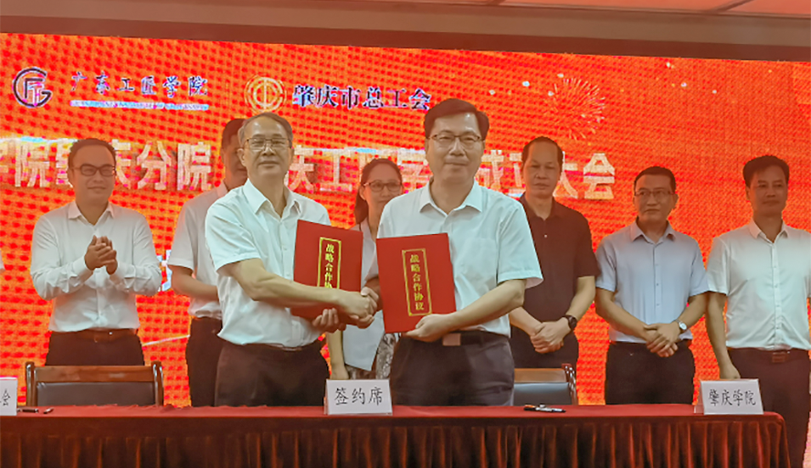 本网讯 9月28日,广东工匠学院肇庆分院、肇庆工匠学院成立大会在肇庆市总工会举行。校党委副书记、校工会主席谢冠华出席大会,并代表学校与市总工会签订共建广东工匠学院肇庆分院、肇庆工匠学院的战略合作协议。