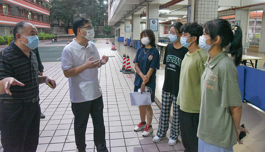 谢冠华实地走访了学生宿舍、食堂、超市、运动场、快递站等重点区域和场所,与师生亲切交谈,仔细询问他们在学习生活中所需所求,叮嘱同学们在疫情防控期间,要做好自身健康第一责任人,表示学校会积极帮助大家解决学习和生活上遇到的问题,全力保障师生健康安全和校园平稳有序。
