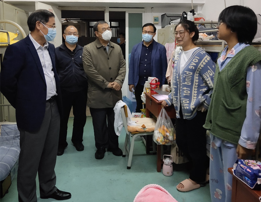 本网讯 11月30日晚,校长吴业春、副校长李新昌一行走进星湖校区,深入学生宿舍、饭堂、操场等,走访调研疫情防控期间学生们的学习状态和生活情况,与新疆、西藏等学生亲切交谈,倾听学生心声和诉求。叮嘱学生要加强体育锻炼,提升身体素质;做好学业规划,做好御寒保暖,保持良好的身心状态来更好地学习生活、抗击疫情。