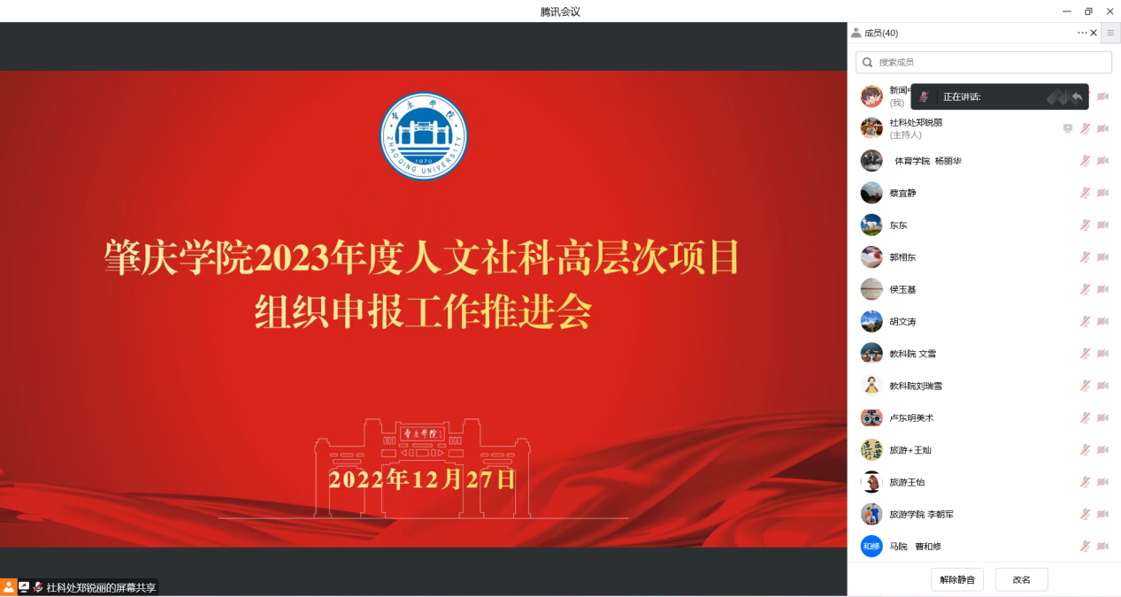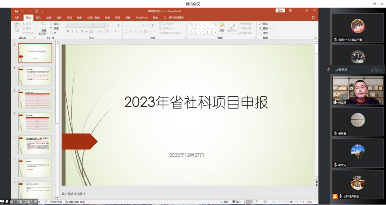 本网讯 12月27日,我校召开2023年人文社科高层次项目组织申报工作推进会(线上),副校长胡文涛出席并作讲话,科技处、社科处主持工作副处长徐士河主持会议。