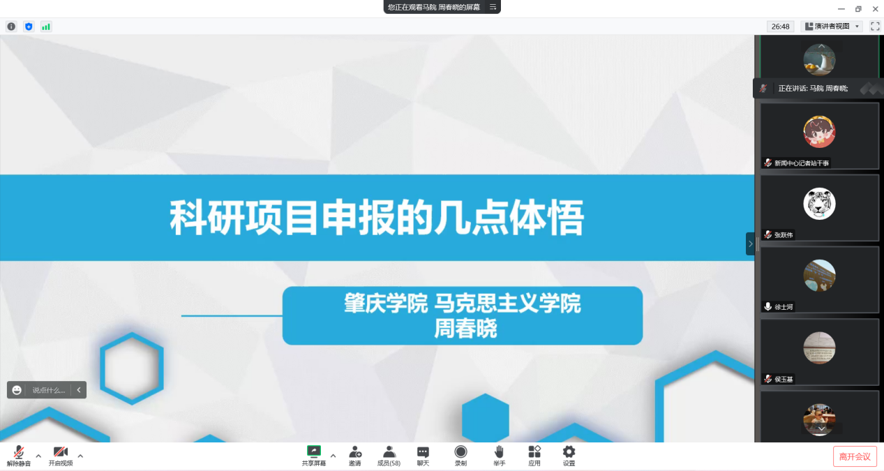 马克思主义学院周春晓博士结合自身科研项目申报经历,分享立项经验,强调项目选题要突出问题意识,关注社会热点和理论前沿,建议科研教师、研究人员多思考、多交流、多尝试。