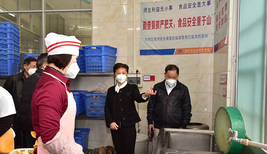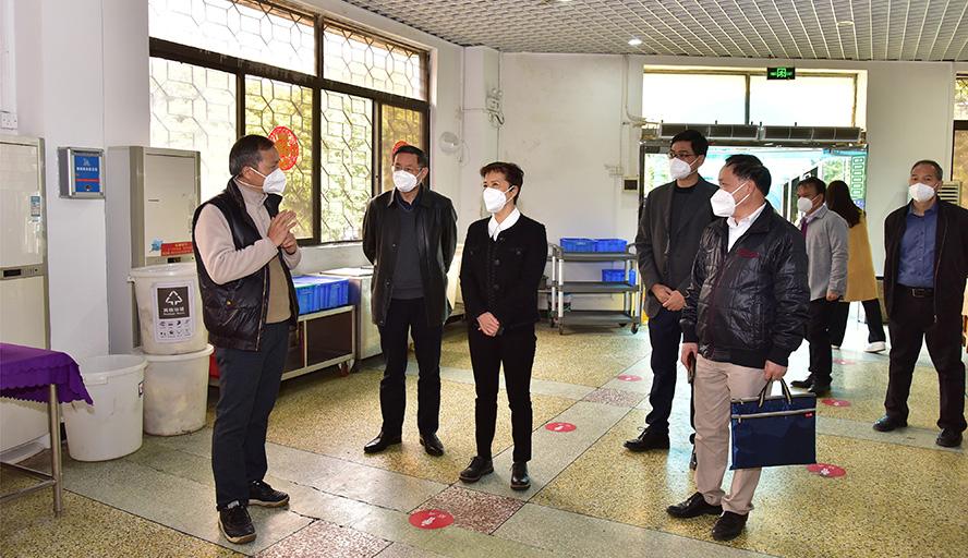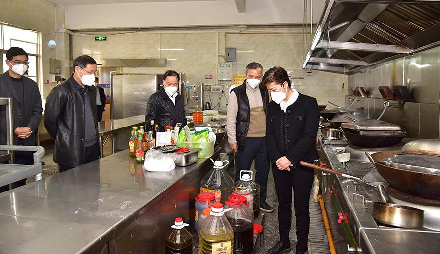 本网讯 为进一步压紧压实食堂食品安全属地管理责任和学校主体责任,12月29日,肇庆市副市长何婧率市、区市场监督管理局相关负责人深入我校食堂开展食品安全“两个责任”包保督导,校长吴业春、副校长唐冬冬和后勤管理处相关人员陪同。