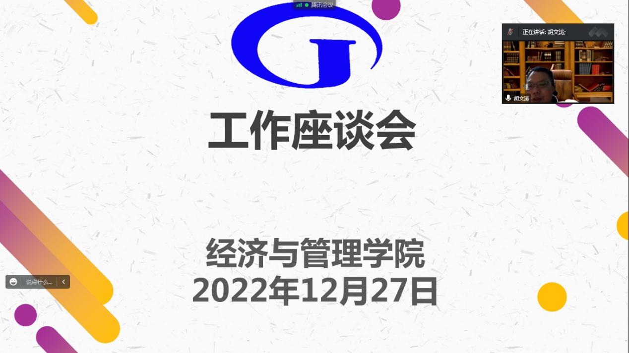 本网讯 12月27日晚,胡文涛副校长参加经济与管理学院班子在线上召开的年终工作座谈会,总结上一年成绩,展望新一年发展。学院党委书记黎天宇主持,学院党政班子成员和重点学科负责人李华军参加。