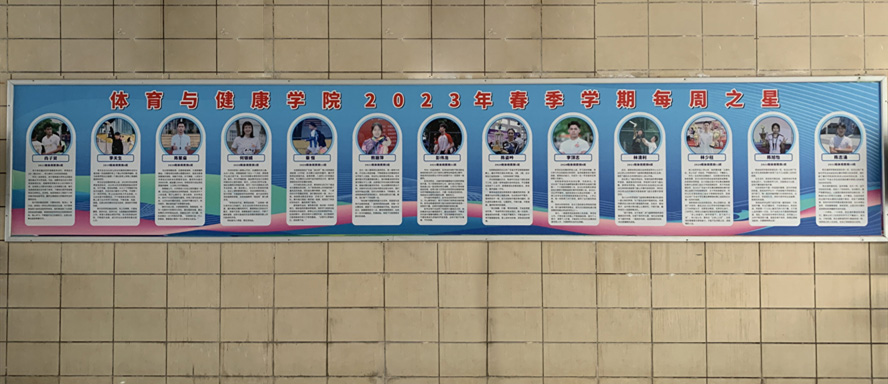 “每周之星”的选拔对象是体育学院在近一段时间积极进取、力争上游的优秀学生,包括学业上的领跑者、比赛中的获奖者以及志愿服务里的先行者等,由学院各学生机构轮流提名、学工团队审核通过后,在体育馆门口挂出易拉宝海报,展示自信青春风采。