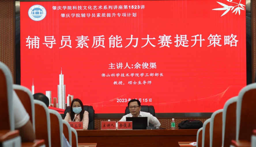 本网讯 为进一步加强学校辅导员队伍的专业化和职业化建设,12月15日,佛山科学技术学院学工部部长余俊渠教授受邀来到我校举办《辅导员素质能力大赛提升策略》的专题讲座。讲座由学生工作部主持全面工作副部长陈玉华主持,各二级学院党委副书记、书院常务副院长、全体辅导员参与。