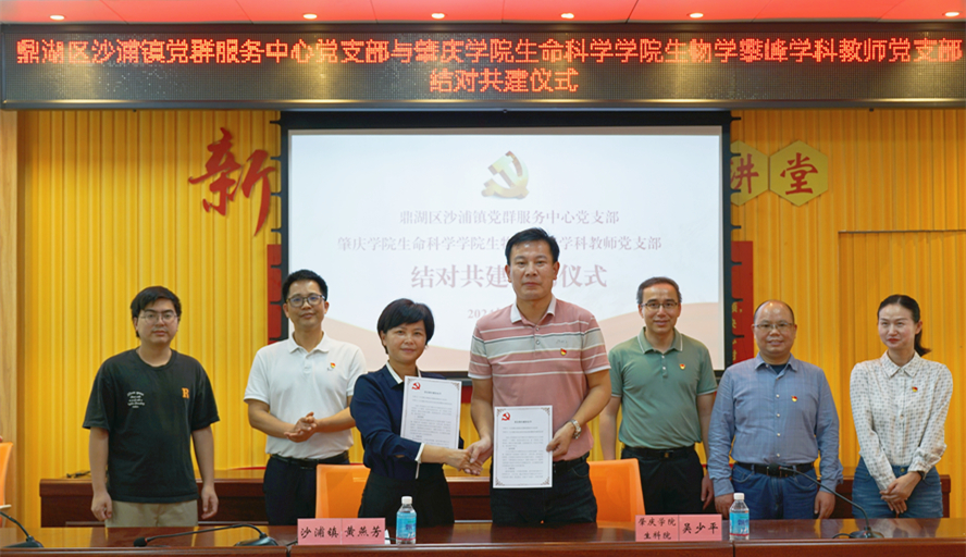 参观结束后,生命科学学院生物学攀峰学科教师党支部与鼎湖区沙浦镇党群服务中心党支部举行了党支部结对共建座谈会。双方签订了结对共建协议书,围绕乡村振兴战略,在美丽沙浦建设规划、南药产业提升、政策法规宣传、香蕉优良品种提质、教育科普、大学生社会实践等方面达成合作意向。