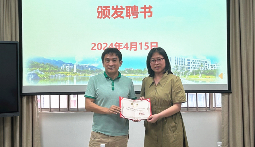 活动现场,学院主持工作副院长于增辉为陈定刚教授颁发肇庆学院兼职教师聘书