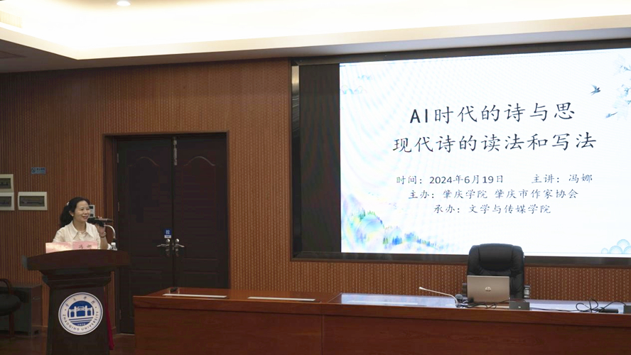 本网讯 6月19日,一场由我校和肇庆市作家协会联合主办,文学与传媒学院承办的讲座在我校举行,诗人冯娜应邀以《AI时代的诗与思》为题,与师生们分享现代诗的读法与写法。校党委书记谢冠华出席,150余名师生参加。