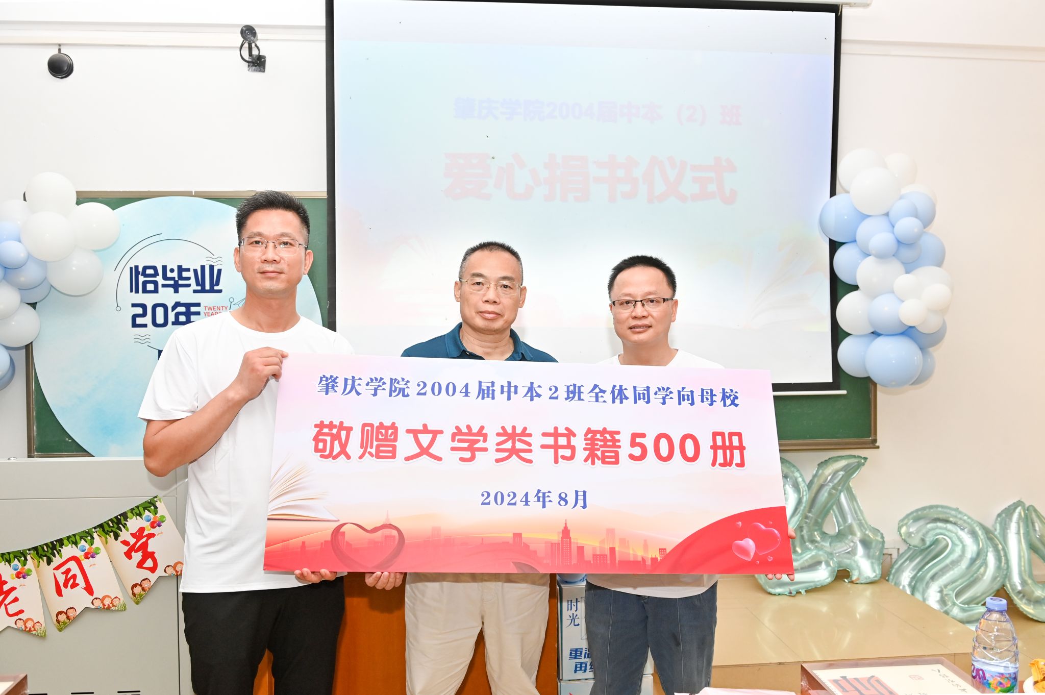 本网讯 8月3日,我校2004届中文本科(2)班毕业20年回馈母校捐书仪式在第二教学楼201室举行。图书馆(档案馆)馆长班荣鼎、文学与传媒学院党委书记陈伟林及相关负责人出席捐书仪式。