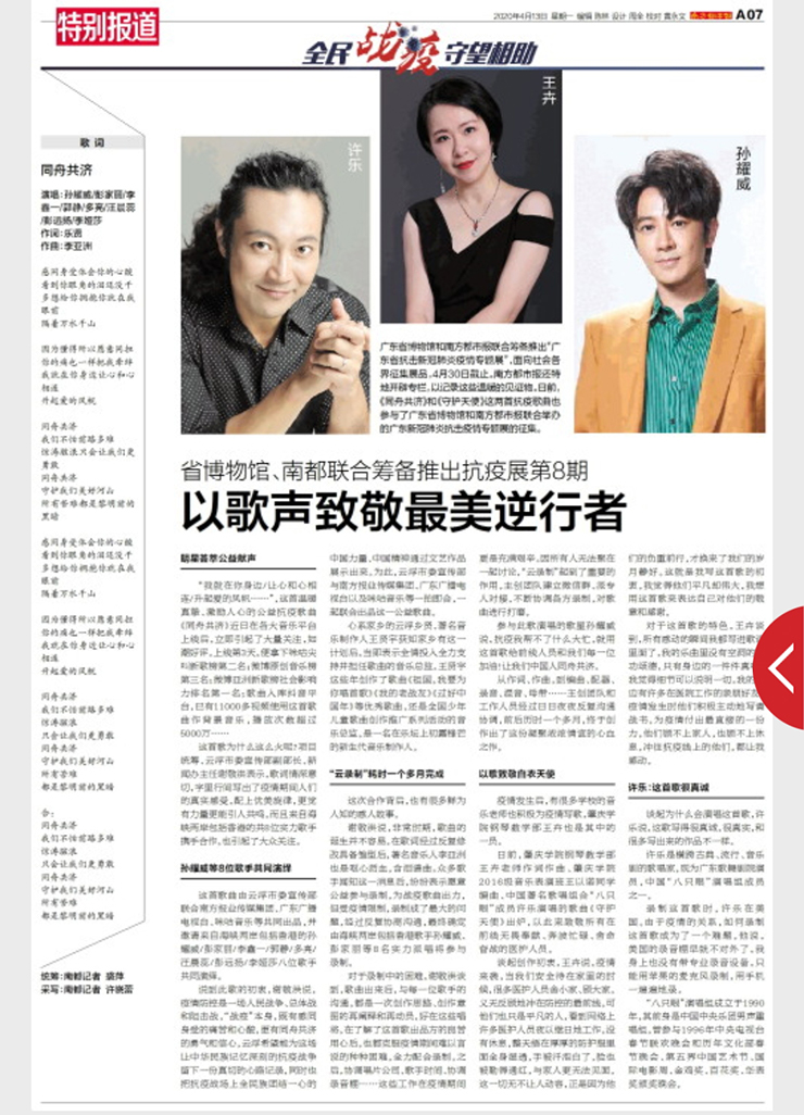 本网讯 近日,由广东省博物馆和南方都市报联合筹备推出的“广东省抗击新冠肺炎疫情专题展”面向社会各界征集展品。同时,南方都市报开辟专栏,对入展作品作以介绍。由我校音乐学院教师王卉作词作曲的抗疫歌曲《守护天使》获展,并于4月13日刊登在《南方都市报》A07特别报道专版上。