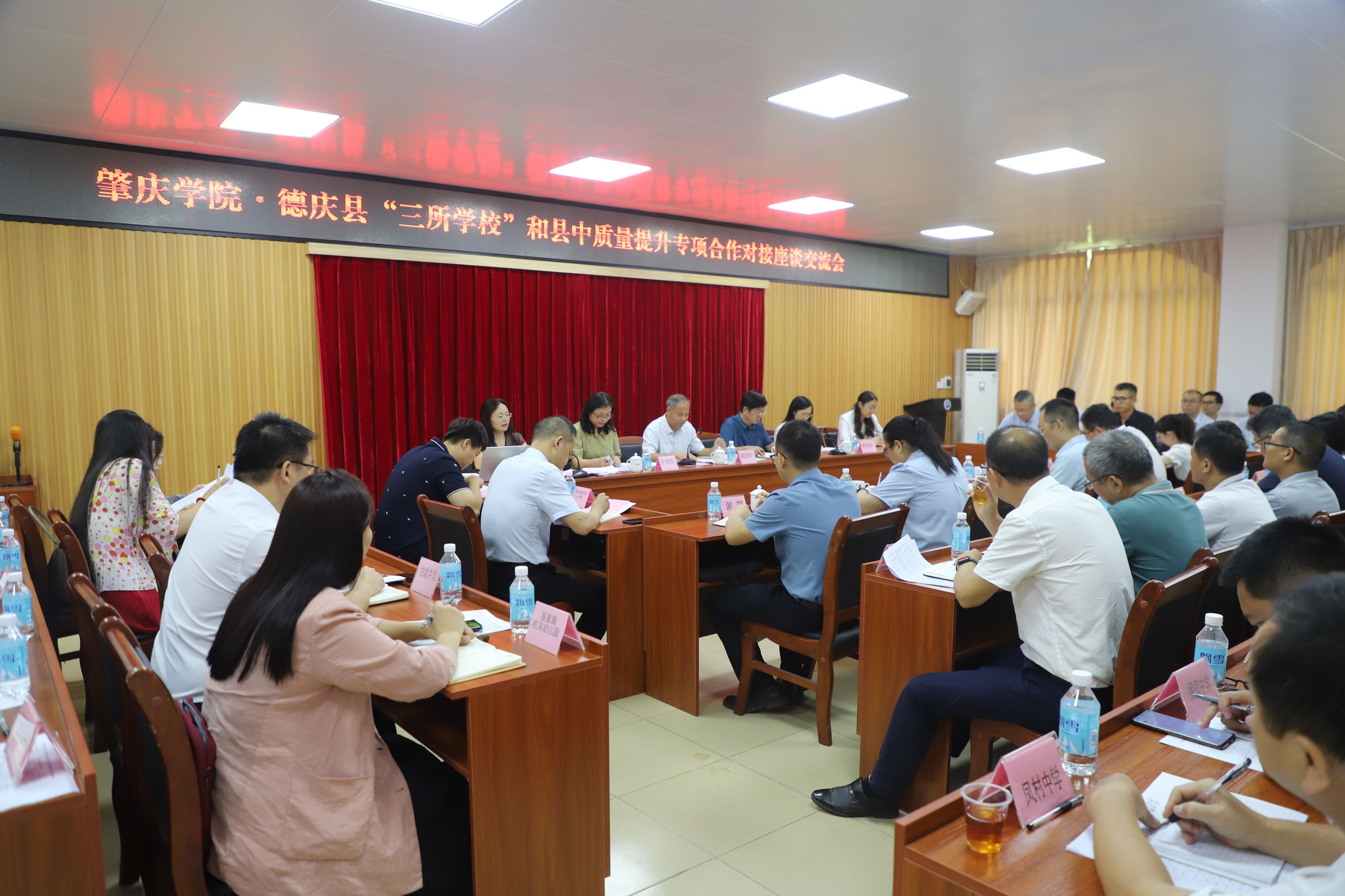 德庆县委教育工委副书记、德庆县教育局党组成员、副局长岑星源介绍了德庆县“三所学校”和县中质量提升项目建设基本情况,指出了目前存在的六大问题及已采取的措施,并向我校提出了帮扶需求。德庆县委副书记、中共德庆县委教育工委书记胡小攀感谢我校对德庆县教育的帮扶,勉励双方在未来三年的精诚协作,共同努力提升德庆县“三所学校”教育教学质量。