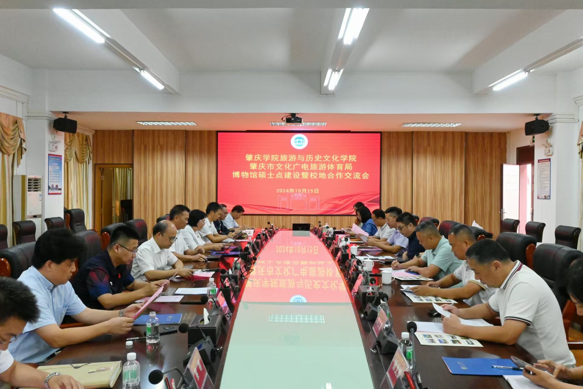 本网讯 10月15日,旅游与历史文化学院召开博物馆硕士点建设暨校地合作交流会。广东工业大学帮扶队队长刘怡军,肇庆市文化广电旅游体育局副局长曾善杰出席,市博物馆、包公文化园、叶挺独立团团部旧址纪念馆、市文化馆相关单位负责人,科学技术部、研究生院负责人,旅游学院班子成员、骨干教师参会。会议由旅游学院党委书记杨雪梅主持。
