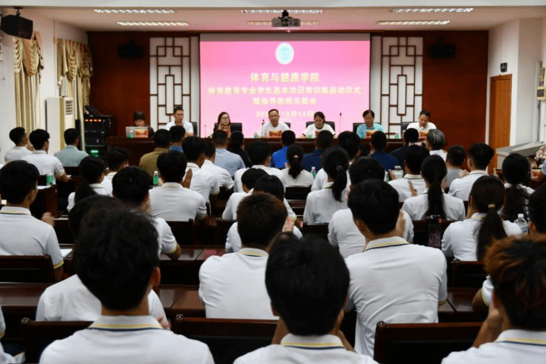 本网讯 10月14日,体育与健康学院体育教育专业学生基本功日常训练启动仪式暨指导导师见面会隆重举行。肇庆市教师发展中心等14名校外实践高级导师出席,体育与健康学院院长郭可雷等学院党政班子成员、体育教育专业负责人、校内指导导师以及来自2022级、2023级的60名“卓越体育教师班”学生参加。