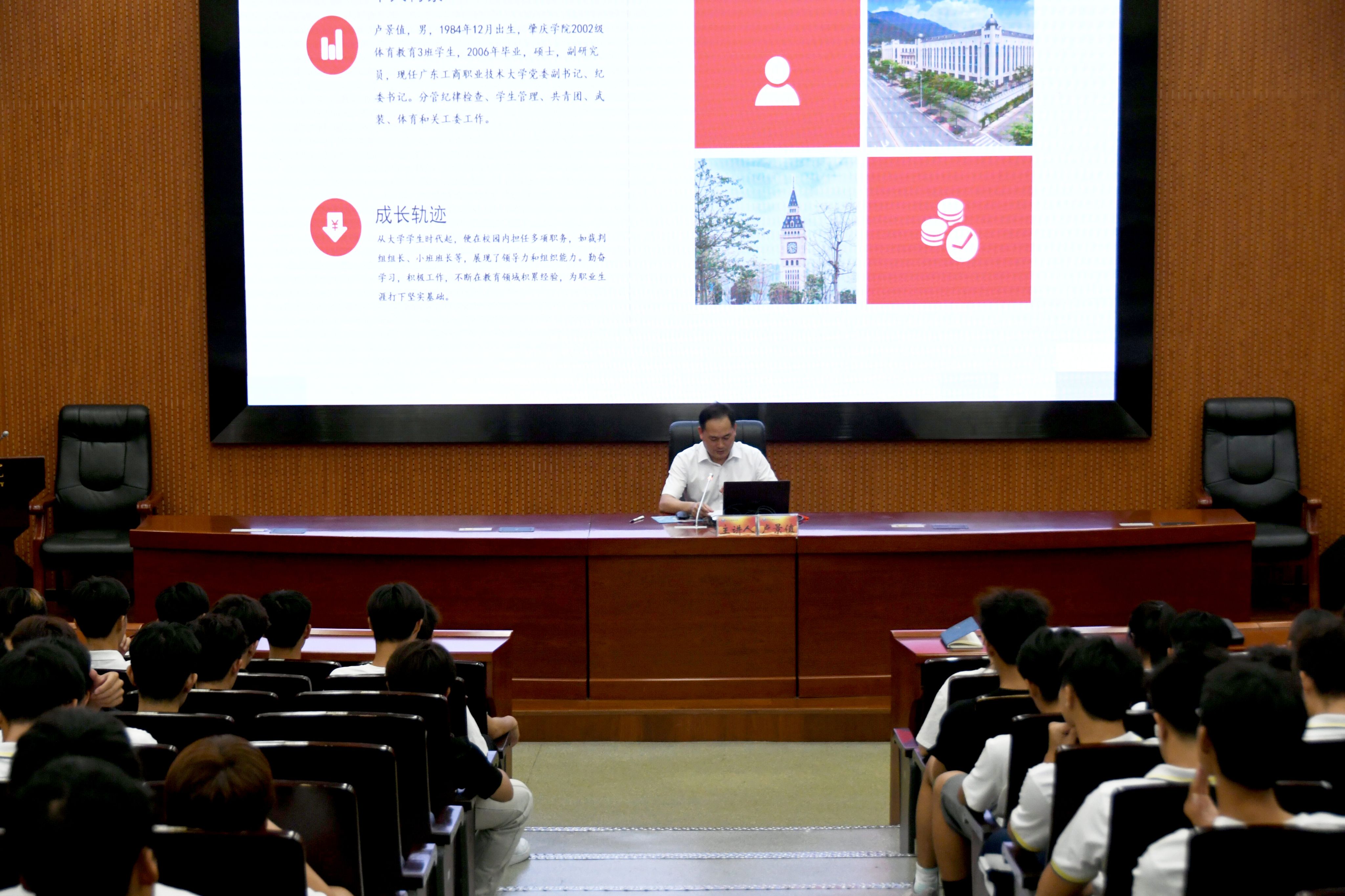 卢景值自2006年毕业后一直在广东工商职业技术大学工作,先后担任辅导员、学工部副部长、部长、团委书记等职,2020年担任党委副书记、纪委书记至今。讲座中,卢景值对自己在学校期间的成长轨迹做了回顾,并对自己毕业后的经历进行了简要介绍。他强调,作为新入校的大学生,要把精力着重放在课程学习、技能掌握上,同时要通过担任学生干部的方式主动挑重担子、啃硬骨头,积极拓展人脉,培养心理素质。他勉励新生“多学多干练就本领赴职场,又好又专走向岗位启新程”,在学习和工作当中不断成长,既专注于当下,又着眼于未来,明确目标,规划前程,乐于奉献。