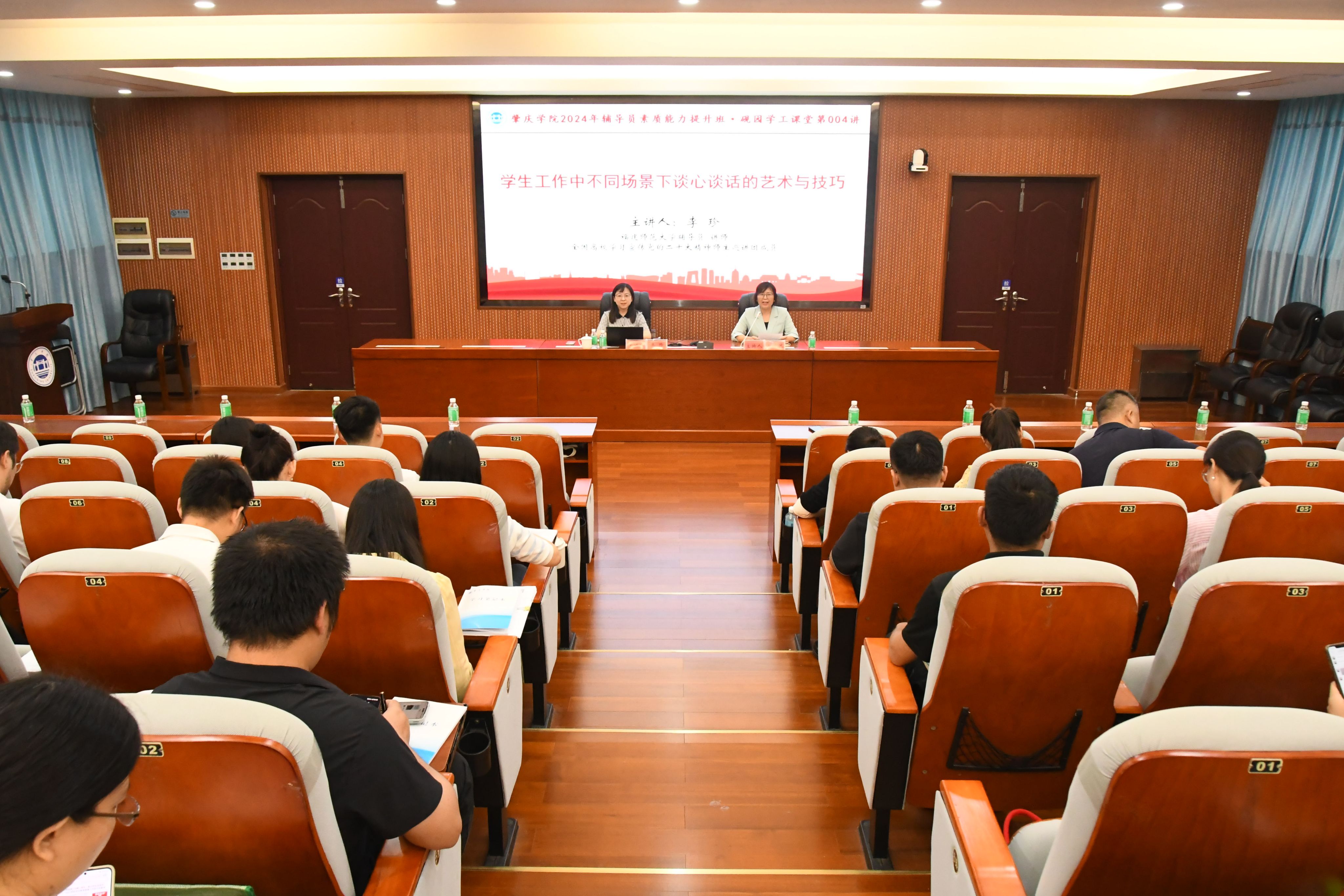 本网讯 11月15日,“肇庆学院2024年辅导员素质能力提升班”暨砚园学工课堂第四讲《学生工作中不同场景下谈心谈话的艺术与技巧》在行政楼第二会议室举行。讲座特邀福建师范大学辅导员、全国高校学习宣传党的二十大精神师生巡讲团成员、2022年全国高校辅导员素质能力大赛一等奖获得者李珍老师来校授课,学生工作部副部长董业凤主持,辅导员培训班全体成员参加。