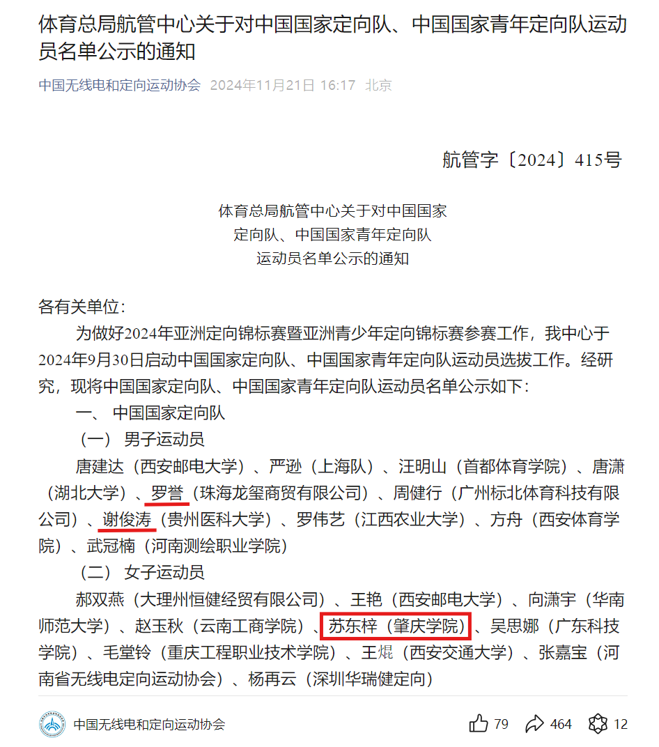 本网讯 近日,国家体育总局航空无线电模型运动管理中心发布了关于中国国家定向队和中国国家青年定向队运动员名单的公示,肇庆学院体育与健康学院2021级体育教育专业的苏东梓同学成功入选中国国家定向队,将代表中国队出征2024年亚洲定向运动锦标赛暨亚洲青少年定向锦标赛。此外,我校2012级校友罗誉和2014级校友谢俊涛也一同入选,为母校争得了荣誉。