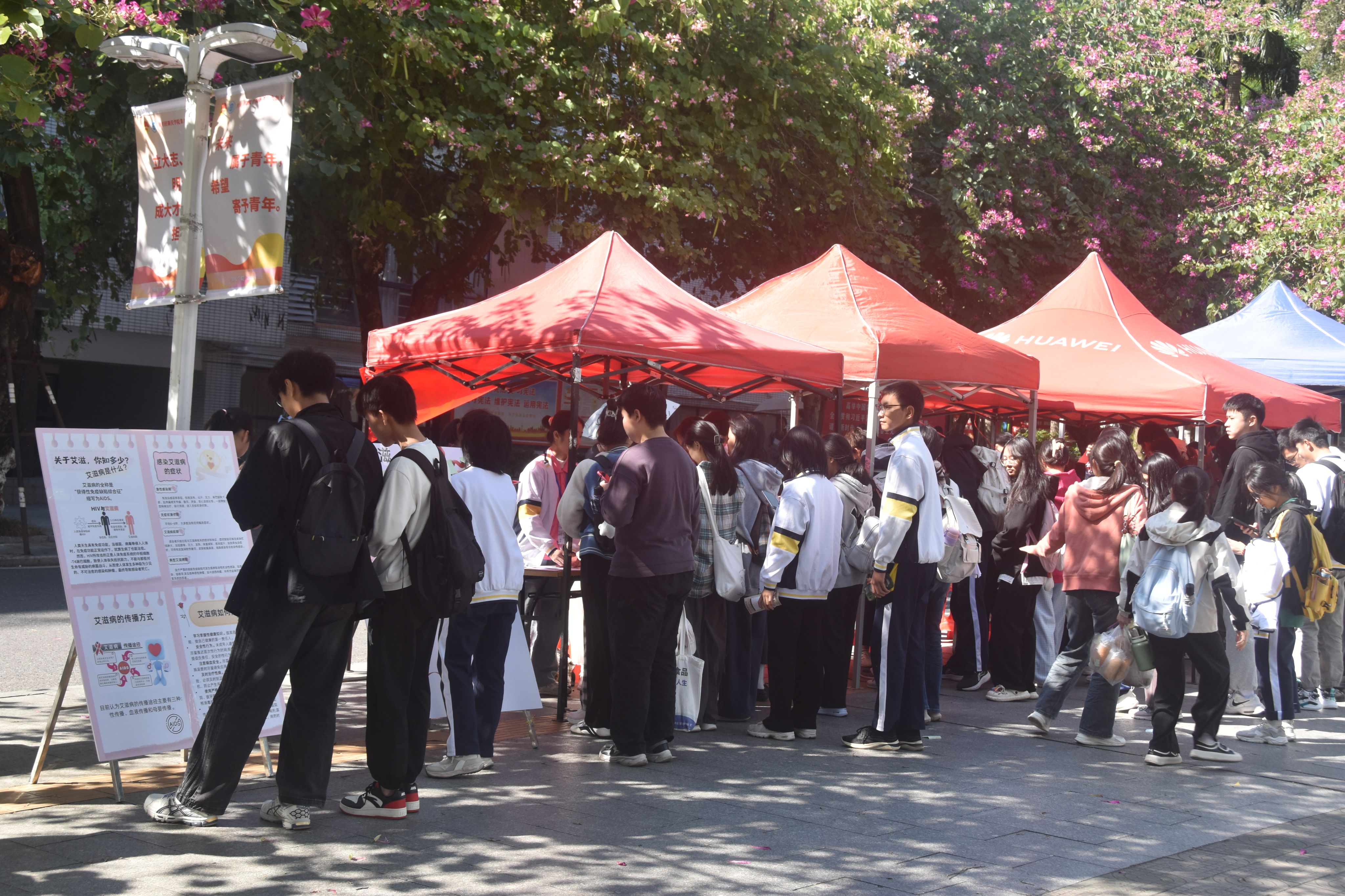 此外,学校在校道上设置了艾滋病预防的宣传摊位,摆放艾滋病防治知识宣传展板,开展学生喜闻乐见的现场互动小游戏,如防艾知识有奖问答、发布校园抗艾防艾宣言、绘制抗艾防艾的画作、制作艾滋病预防宣传折页等。
