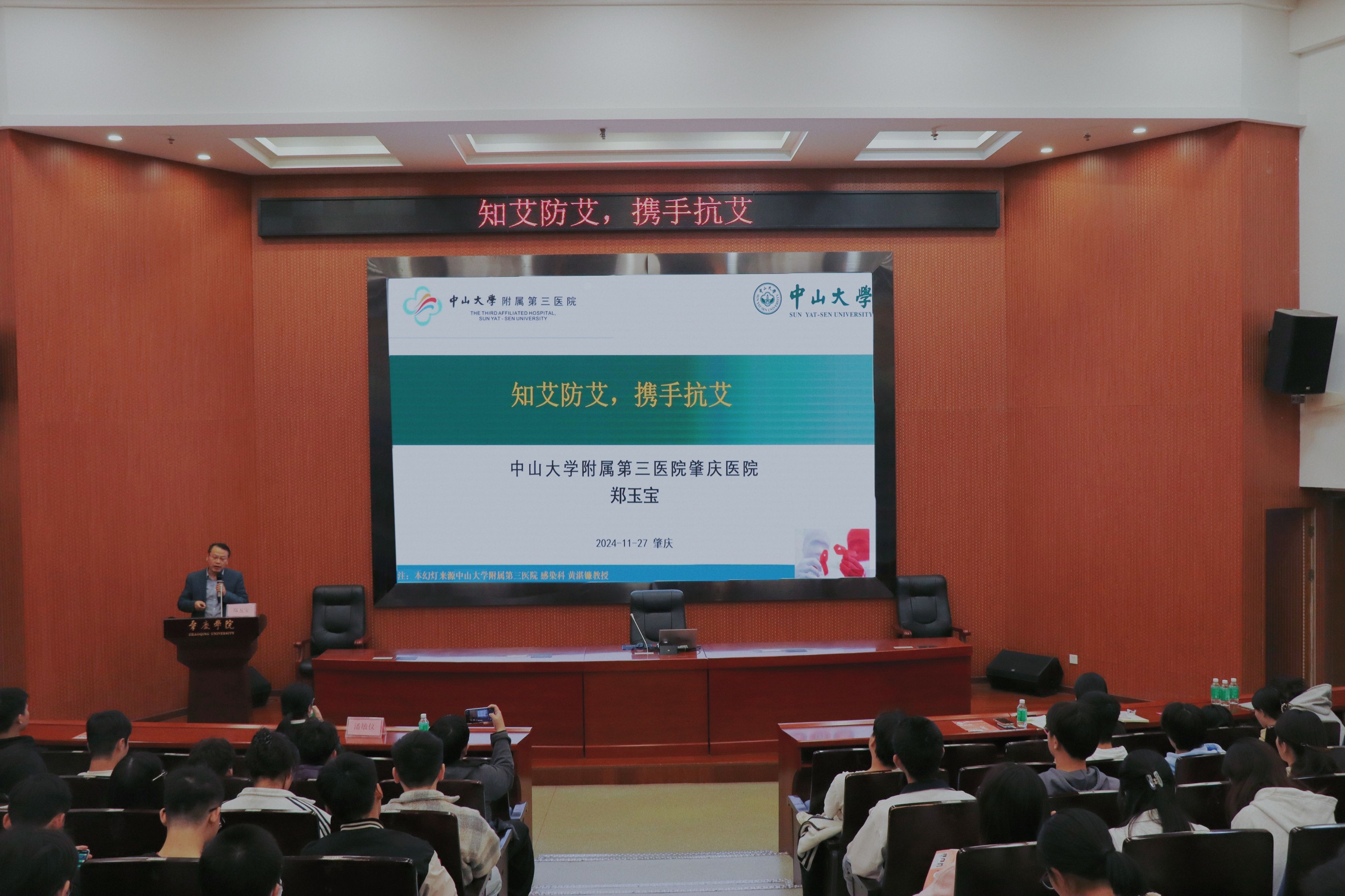 中山大学附属第三医院肇庆医院感染科主任郑玉宝教授通过案例和数据详细讲解了艾滋病的危害,结合艾滋病传播途径有针对性地提出预防措施。他强调,自己是健康的第一责任人,希望学生能将本场讲座的知识转化健康行为。