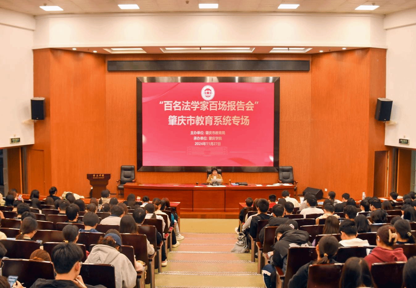 本网讯 11月27日,“百名法学家百场报告会”法治宣讲活动肇庆市教育系统专场在我校举行。政法学院院长许英主讲,近400名学生参加。