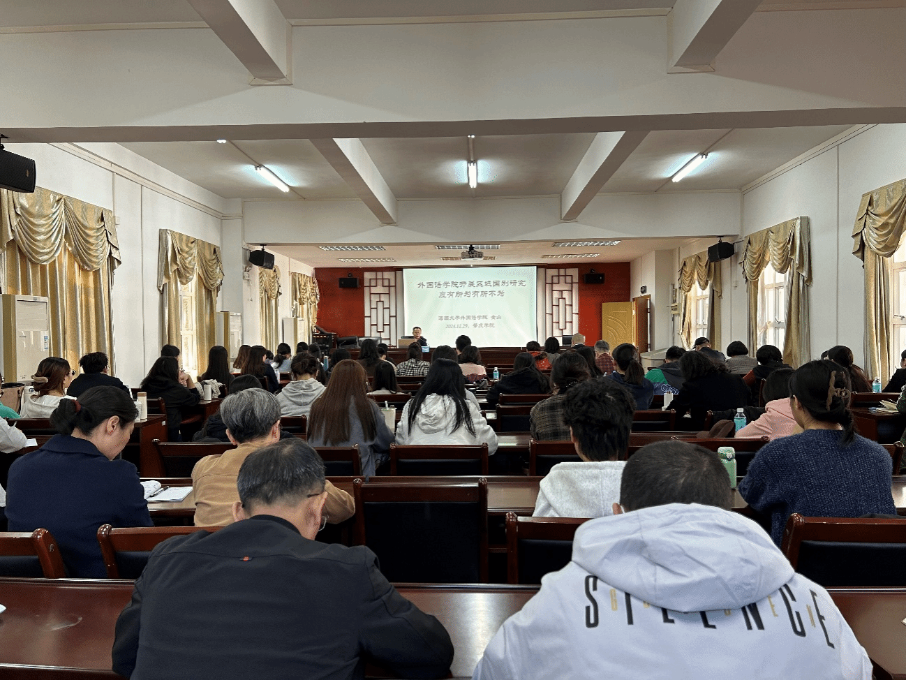 本网讯 11月29日,海南大学外国语学院博士生导师、博士后合作导师金山教授应邀莅临外国语言文化学院,开展主题为“外国语学院开展区域国别研究应有所为有所不为”的讲座。外国语言文化学院全体教师及部分学生代表参加,讲座由副院长于增辉主持。