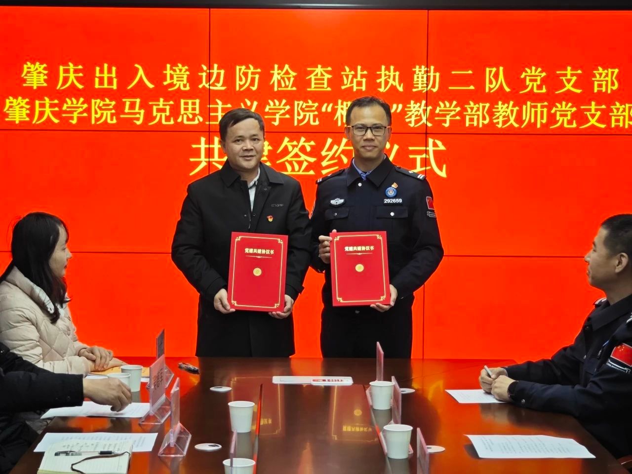 本网讯 近日,为进一步增强基层党组织标准化规范化建设,贯彻落实“强国行”专项行动要求,努力构建“资源共享、优势互补、相互促进、共同提高”的党建工作新格局,肇庆学院马克思主义学院“概论”教学部教师党支部分别与肇庆泓强康复医院党支部、肇庆出入境边防检查站执勤二队党支部举办共建签约仪式暨联建共建主题党日活动。