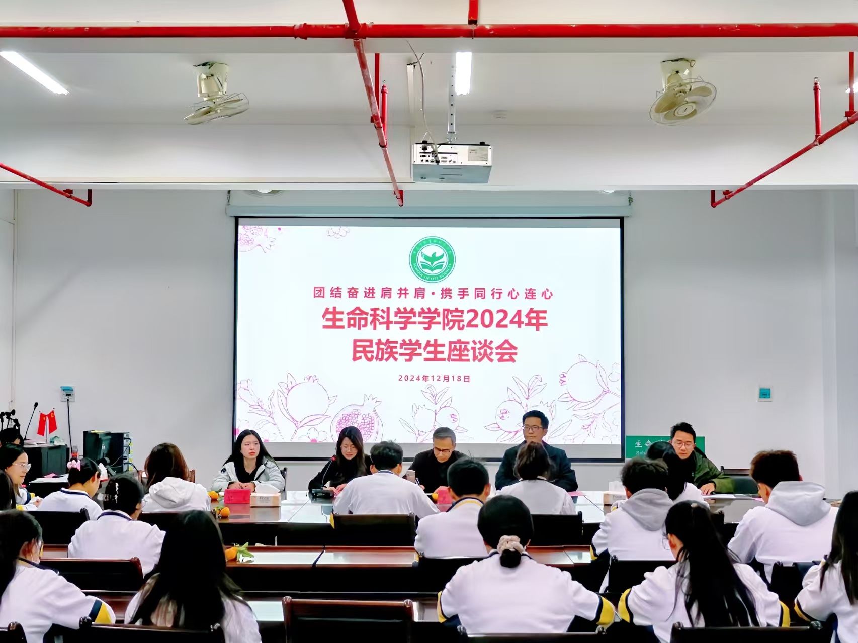 本网讯 12月18日,生命科学学院党委召开“团结奋进肩并肩,携手同行心连心”民族学生座谈会,深入贯彻党的二十届三中全会精神及习近平总书记在全国民族团结进步表彰大会上的重要讲话精神。学院党委书记黄剑青、党委副书记邱兴和、全体辅导员及来自多个民族的26名学生代表参会,会议由辅导员吴颖主持。