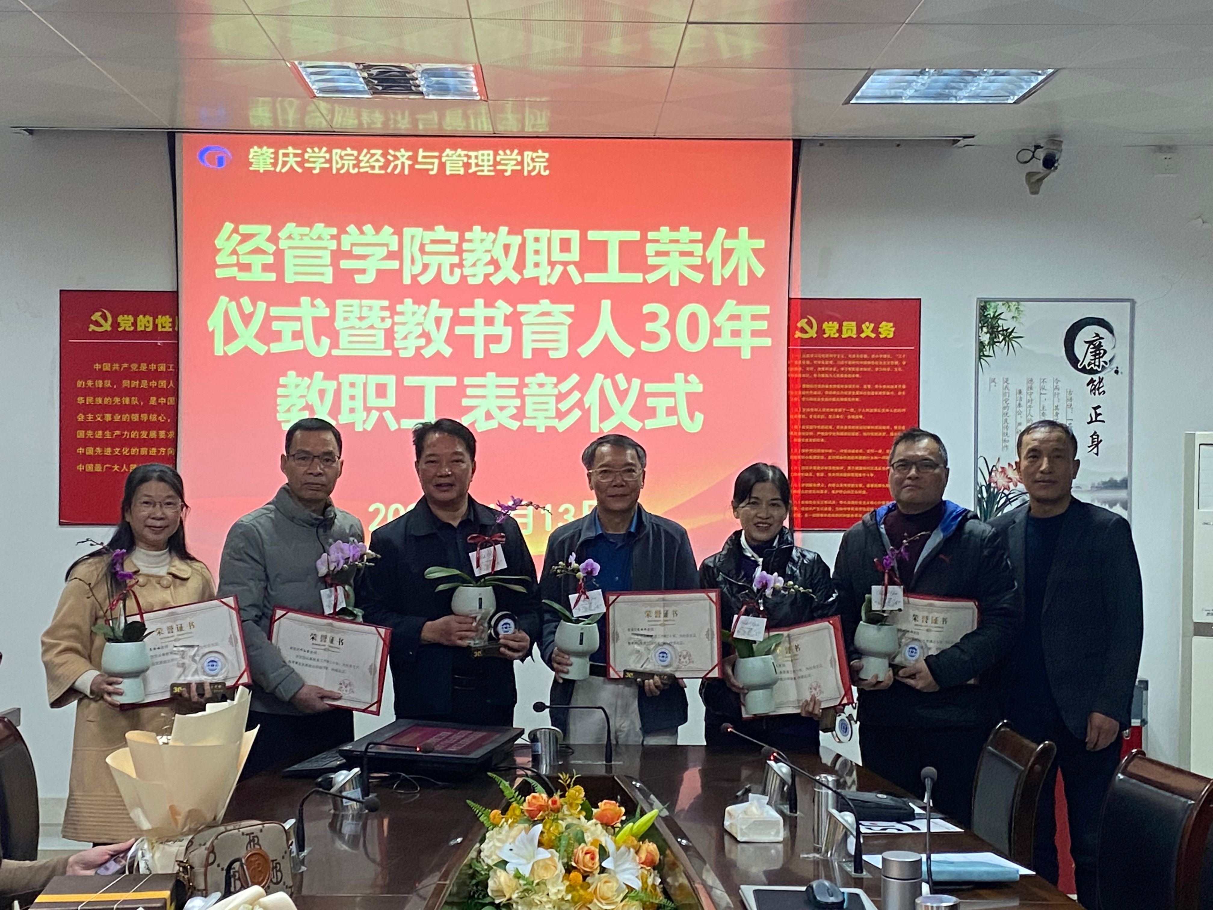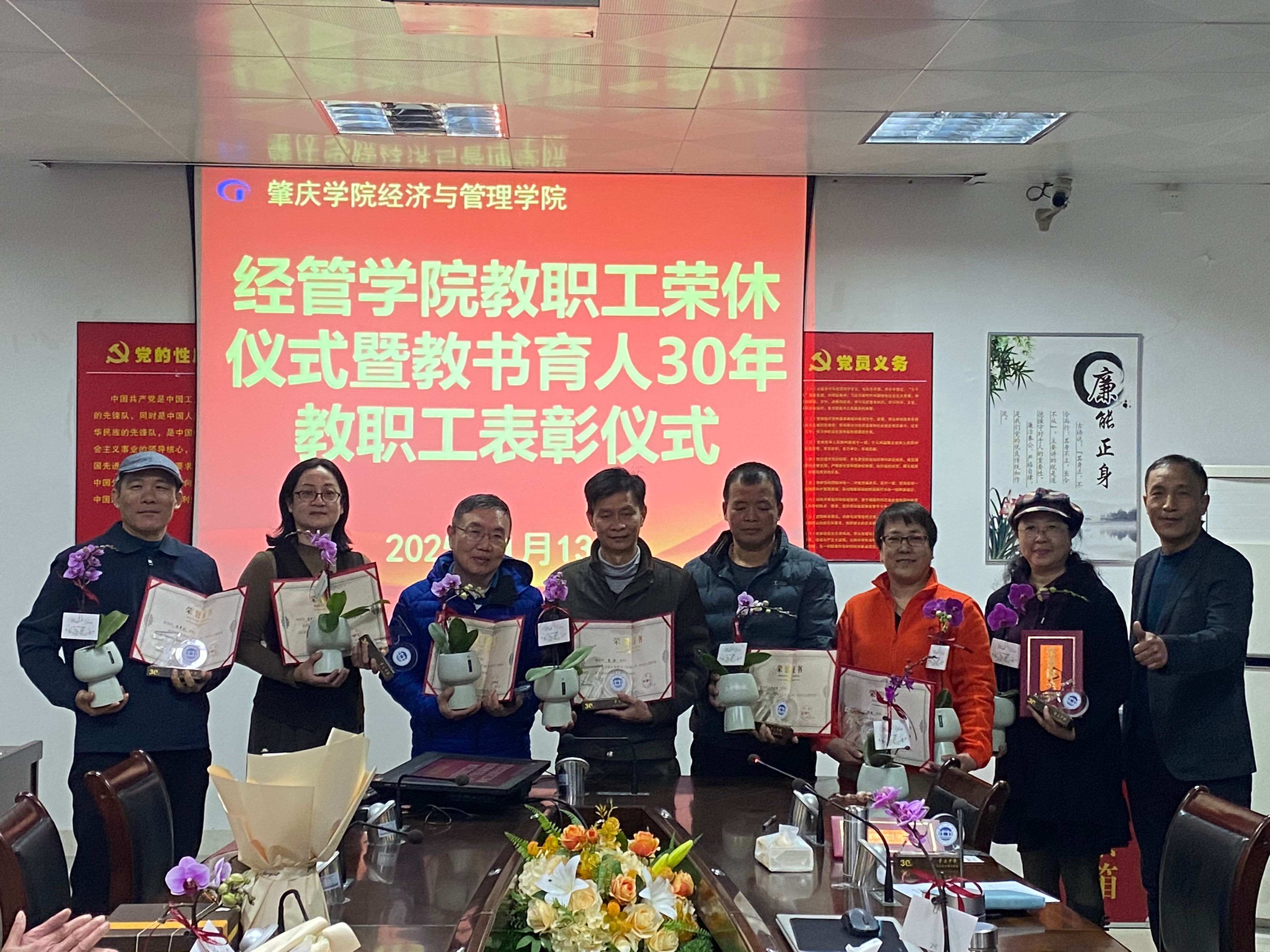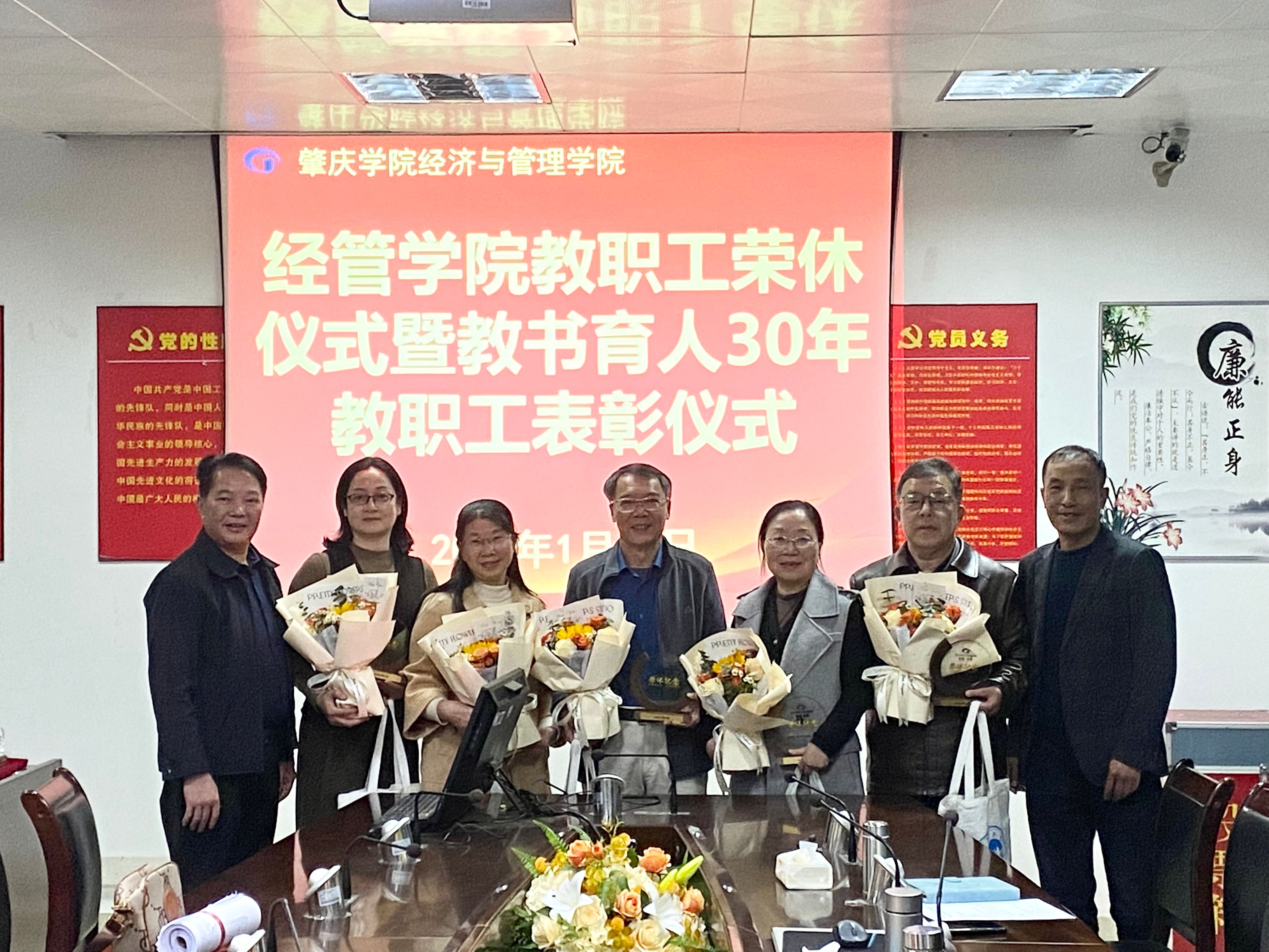 本网讯 1月13日,经管学院隆重举行了教职工荣休仪式暨教书育人30年教职工颁奖仪式,学院党政领导班子成员、各教学系主任与教师代表、学生代表参加了仪式。