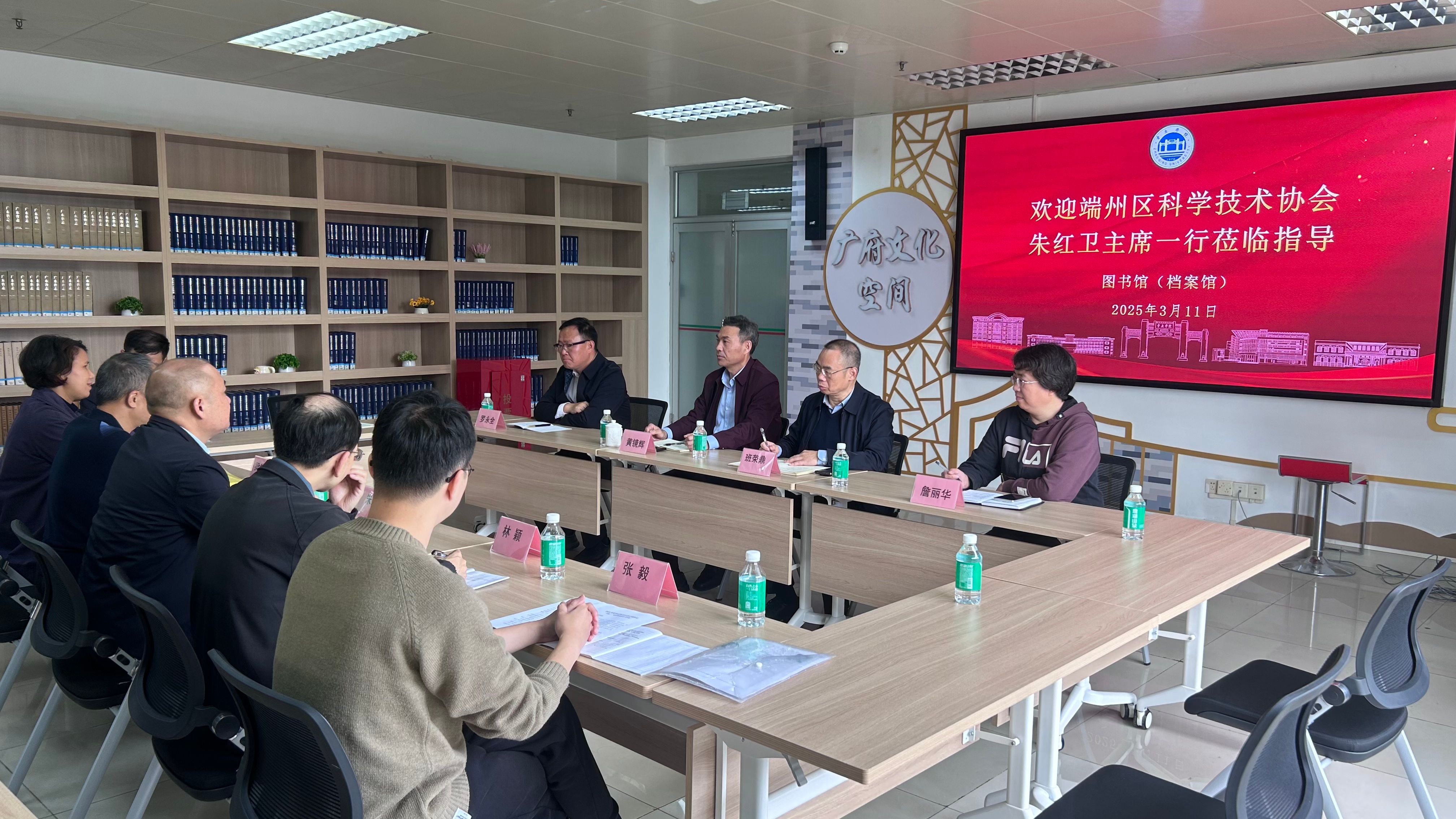 本网讯 3月11日,端州区科学技术协会主席朱红卫、副主席梁伟宇一行到访我校图书馆(档案馆),交流校会双方合作科普、研学等事宜。图书馆(档案馆)馆长班荣鼎、党总支书记黄镜辉、副馆长罗永全、副馆长詹丽华等参与座谈。