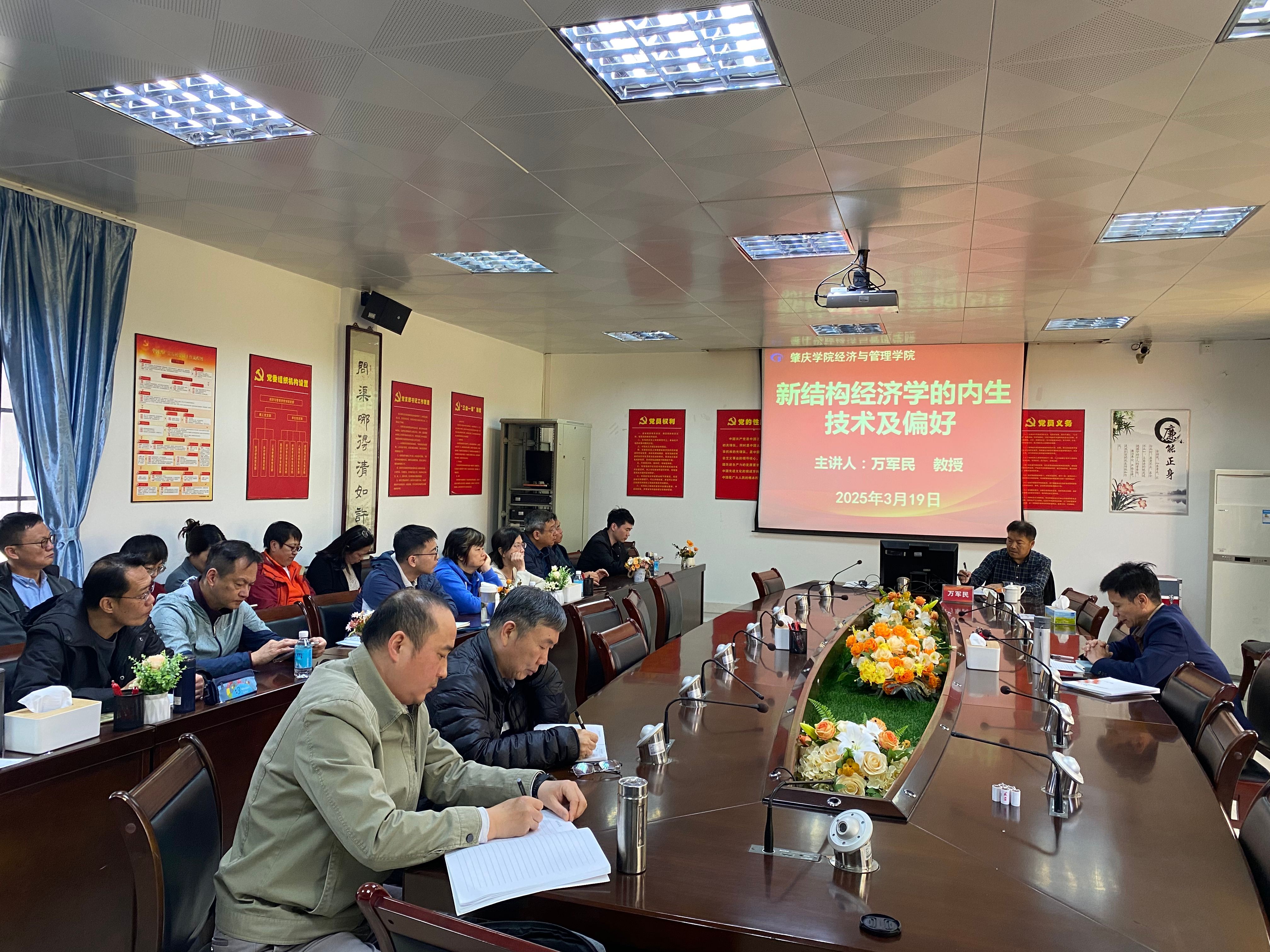万军民教授以《新结构经济学的内生技术及偏好》为题展开报告,全面介绍了新结构经济学的基本原理,他这一研究成果构造了技术内生的增长模型和具有时间偏好的消费者函数,研究不同要素禀赋条件下的技术选择及其均衡结果。研究揭示了根据要素禀赋选择最优技术的重要性,对于劳动密集型发展中国家具有重要启示。随后,现场教师与万军民教授展开了学术探讨,并就智能技术、数字经济等议题展开了深度交流。