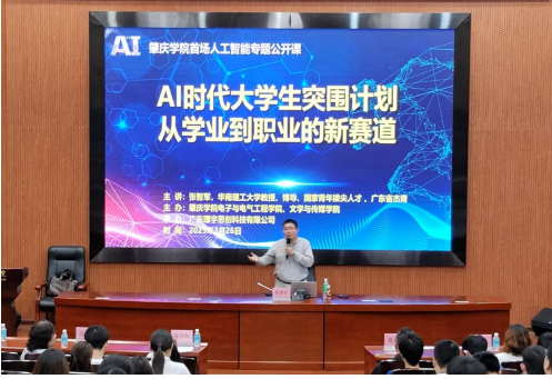 本网讯 3月26日,文学与传媒学院携手电子与电气工程学院,在图书馆学术报告厅共同主办AI人工智能专题讲座《AI时代大学生突围计划——从学业到职业的新赛道》。校友企业、广东環宇思创科技有限公司承办。华南理工大学教授、博士生导师、国家青年拔尖人才张智军主讲,文传学院党委书记陈伟林主持,电子与电气工程学院党委副书记傅汉球及两院两百余名师生代表参加。