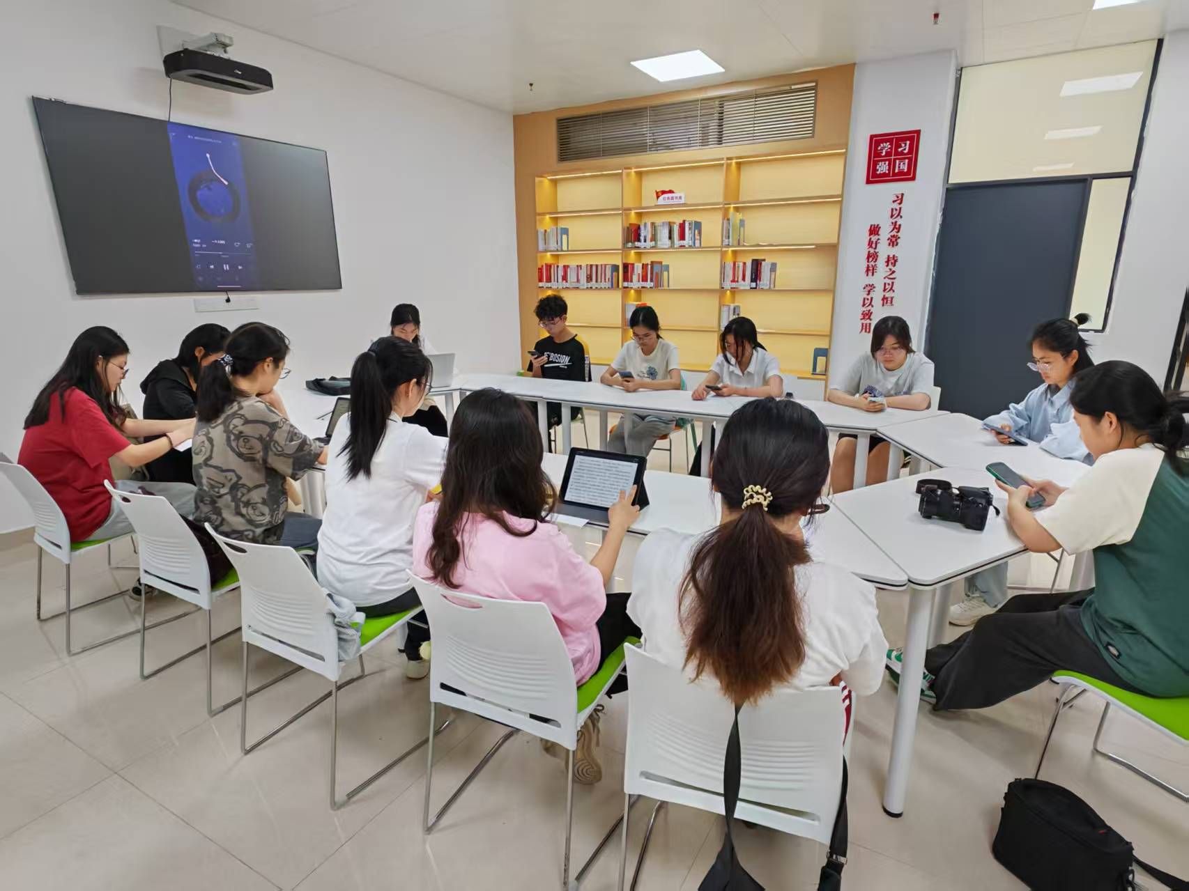 “红色家书”诵读决赛率先拉开帷幕。参赛学生以声传情,深情诵读革命先烈的家书,让在场师生透过文字触摸历史温度,在铿锵语调中感受信仰力量。党团活动室红色经典读书沙龙,同学们围坐共读《觉醒年代》,结合新时代青年使命展开热烈讨论,在思想碰撞中深化对红色文化的理解。共享讨论室在“润心小筑”大学生创业工作室成员的带领下,10多名同学共读经典书籍,交流“被讨厌的勇气”,开启阅读疗愈之旅。现场还设置了“共建社区图书馆”捐书环节,师生积极响应,踊跃捐书。“把生活拼成诗”互动展现场提供充满生活气息的诗句,学生可现场拼接后张贴于展板,在文字重组中凝练生活诗意,吸引师生驻足打卡。