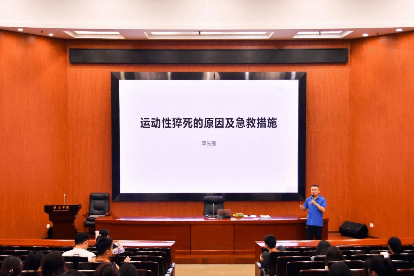 讲座上,邓先强以近年发生的运动性猝死新闻为引,从运动性猝死的概念、特点、易发群体、机制四个方面进行讲解。他提到运动性猝死具有“突然性、意外性、自然性”三个特点。同时,他指出运动性猝死的发生与运动强度、运动量、竞争性等因素紧密相关,掌握运动性猝死的急救方法至关重要,尤其强调心跳停止后的“黄金4分钟”急救时间的关键意义。邓先强详细阐述了心肺复苏的操作步骤,同时讲解了呼吸和颈动脉搏动的检查方法。