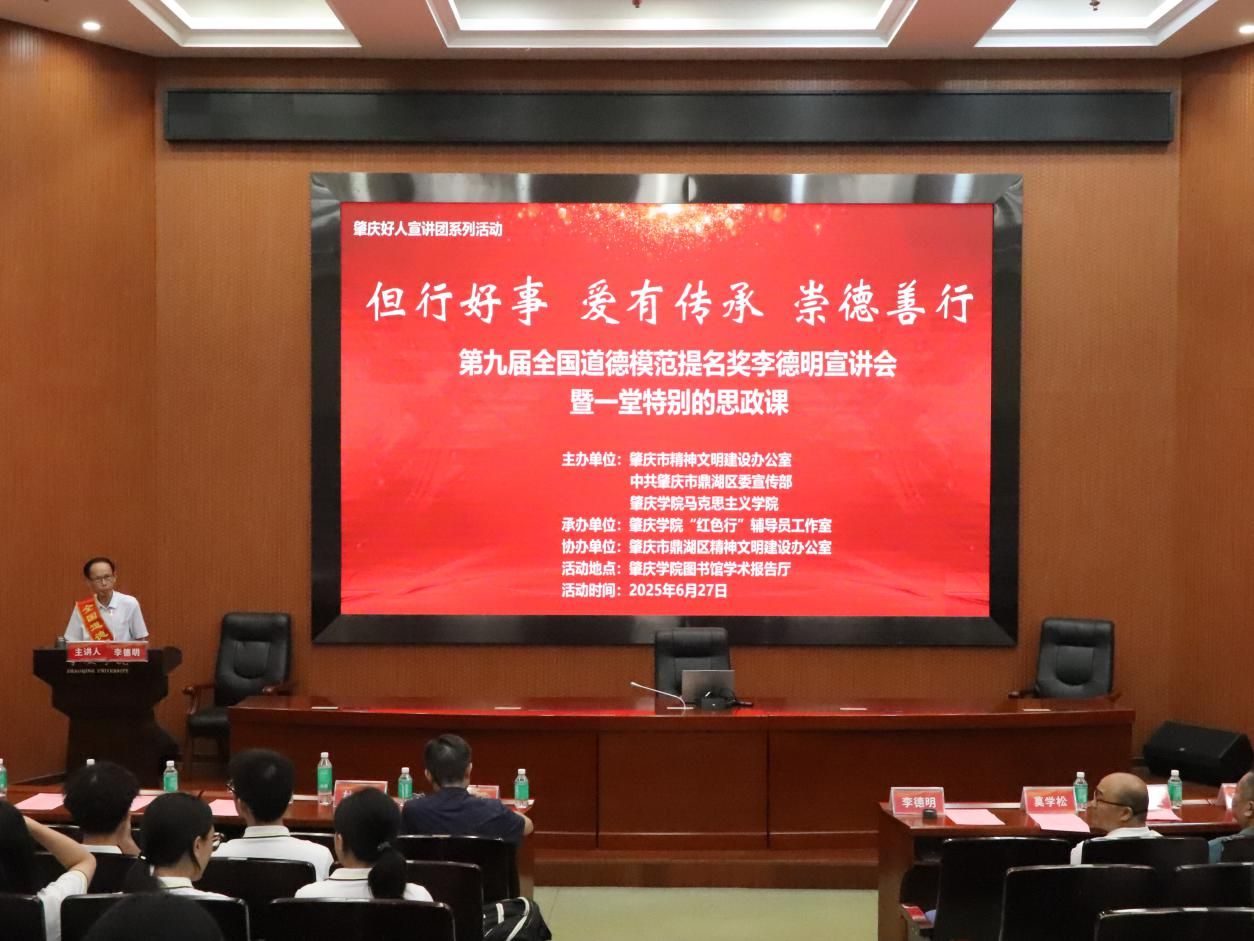 本网讯 6月27日,“但行好事 爱有传承 崇德善行”特别思政课在学校开讲,由第九届全国道德模范提名奖获得者李德明主讲。肇庆市委宣传部、鼎湖区委宣传部和民建鼎湖支部相关负责人,学校马克思主义学院师生代表、“红色行” 辅导员工作室教师代表、各二级学院学生代表400余人齐聚现场,共同聆听道德故事,感悟榜样力量。